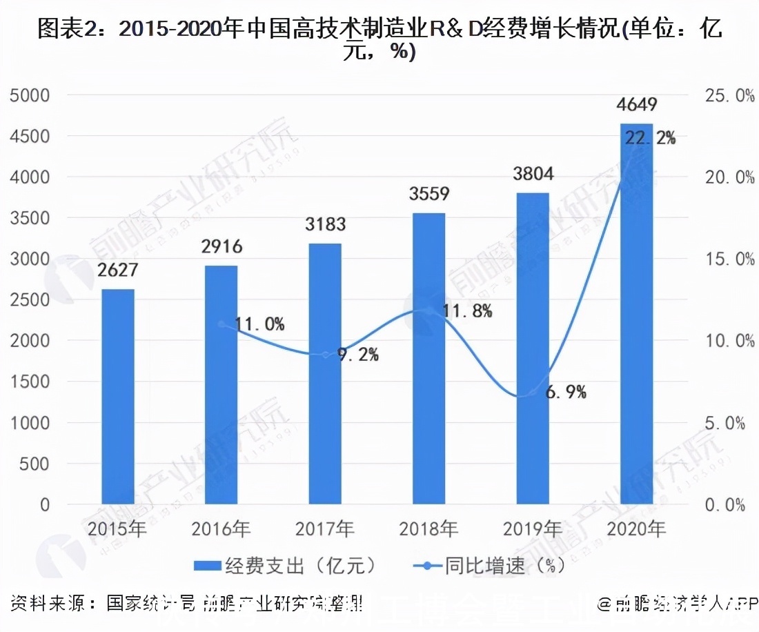 2015-2020年,我国高技术制造业研究与试验发展经费支出规模呈现高速增长态势,从2015年的2627亿元增长至2020年的4649亿元,复合增长率达到12%。其中,2020年的增速更是高达22.2%。