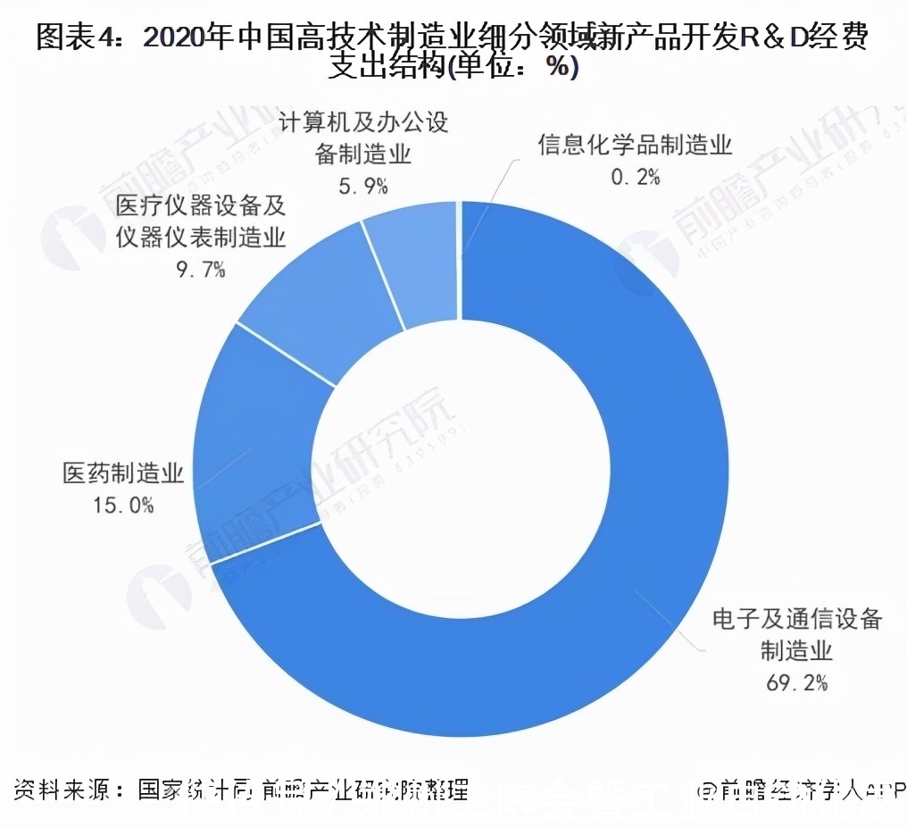 从细分领域的新产品研发经费支出情况来看,2020年,电子及通信设备制造业的新产品R&D经费超过4000亿元,占比高达69.2%,其次是医药制造业占比15.0%,医疗仪器设备及仪器仪表制造业占比9.7%,计算机及办公设备制造业占比5.9%,信息化学品制造业占比0.2%。整体反映出,高技术领域的新产品研发主要集中在电子及通信设备制造业。